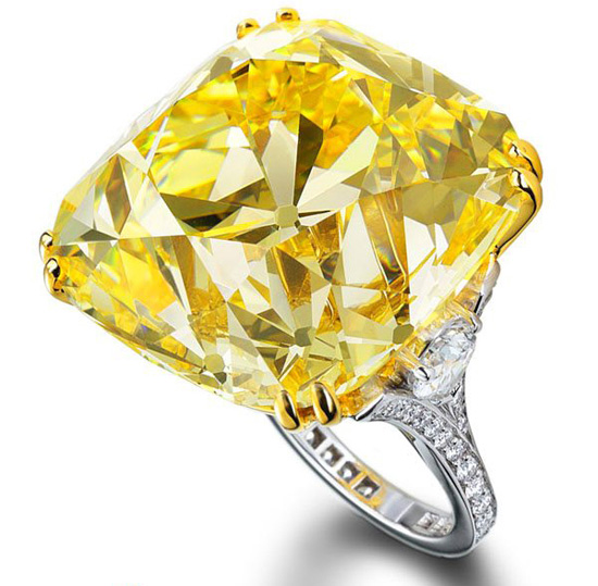 那么,究竟是什么让众人和品牌都对黄钻如此痴迷呢? 拍卖市场上的姣姣者 在2009年秋拍现场上一枚9.03克拉的Fancy Vivid Yellow浓彩黄级(色彩最艳丽、最完美无瑕的黄钻级别)、椭圆形切割、由Graff珠宝商出品的钻戒以每克拉16.9万美元成交。 2010年秋拍,一枚12.02克拉的由Tiffany出品的同样为浓彩黄级、椭圆形切割的钻戒每克拉的成交价格为12.7万美元,两枚黄钻从总价格上来讲都超过了千万元人民币,而价格以每克拉来计算,更是道出了黄钻的珍贵。 今年的3月,伦敦自然历史博物馆展出了一颗金黄色大钻石——科拉落日石(The Cora Sun-Drop),是世界上最令人震惊的钻石之一,几乎无法为其估价。 5月,在日内瓦苏富比拍卖行,两颗底价高达2000万人民币,体重分别高达102.54克拉和82.48克拉的巨钻又被神秘富商买走。这一连串的拍卖说明,黄钻正以不可遏制的速度成为收藏家和钻石爱好者的心宠。  钻石家族的稀有者 彩色钻石中价值较高的一般有黄、蓝、绿、粉、红等色彩较为鲜艳的种类,价格都比白钻要高,具体视稀有程度决定;当钻石中的某些碳原子被氮原子取代之时,钻石晶体因为开始吸收蓝色和紫色光线,钻石便开始呈现黄色,这就是黄钻的形成。 黄钻在选择上基本跟钻石相同,只是多了一个色彩的级别,而行家所说的FVY级便是黄钻里色彩最艳丽、最完美无瑕的级别Fancy Vivid Yellow,也称浓彩黄钻。 这个级别的黄钻是个大珠宝品牌竞相争夺的钻石精灵,除了因为能达到这个级别的黄钻极为稀少以外,还因为它的成品量很低。 De Beers的负责人说:“要想切割出100克拉的完美黄钻,至少需要500克拉的原石。” 珠宝品牌的宠儿 因为其高贵、鲜艳的色泽,黄钻给了众多珠宝品牌创意的可能性——夏日的阳光、盛开的鸢尾,一股琼浆凝结般的势力向我们袭来,时而清新,时而炙热,但从来不失其高贵的气质,如同非洲丛林的狮子般的王者之风,这就是黄色钻石的力量。很多珠宝品牌都被这种美所打动,纷纷以黄钻为主题推出一系列典范之作。