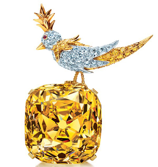 在纽约第五大道Tiffany &Co.总店一楼的一座专用展示柜中,陈列着这颗品牌有史以来最大的天然黄钻供人们鉴赏。这颗著名的Tiffany黄钻在品牌设计师“珠宝诗人”Jean Schlumberger的绝妙创作下,诞生了名为“石上鸟”的高级珠宝作品,是Tiffany &Co.纽约总店里的“镇店之宝”。
